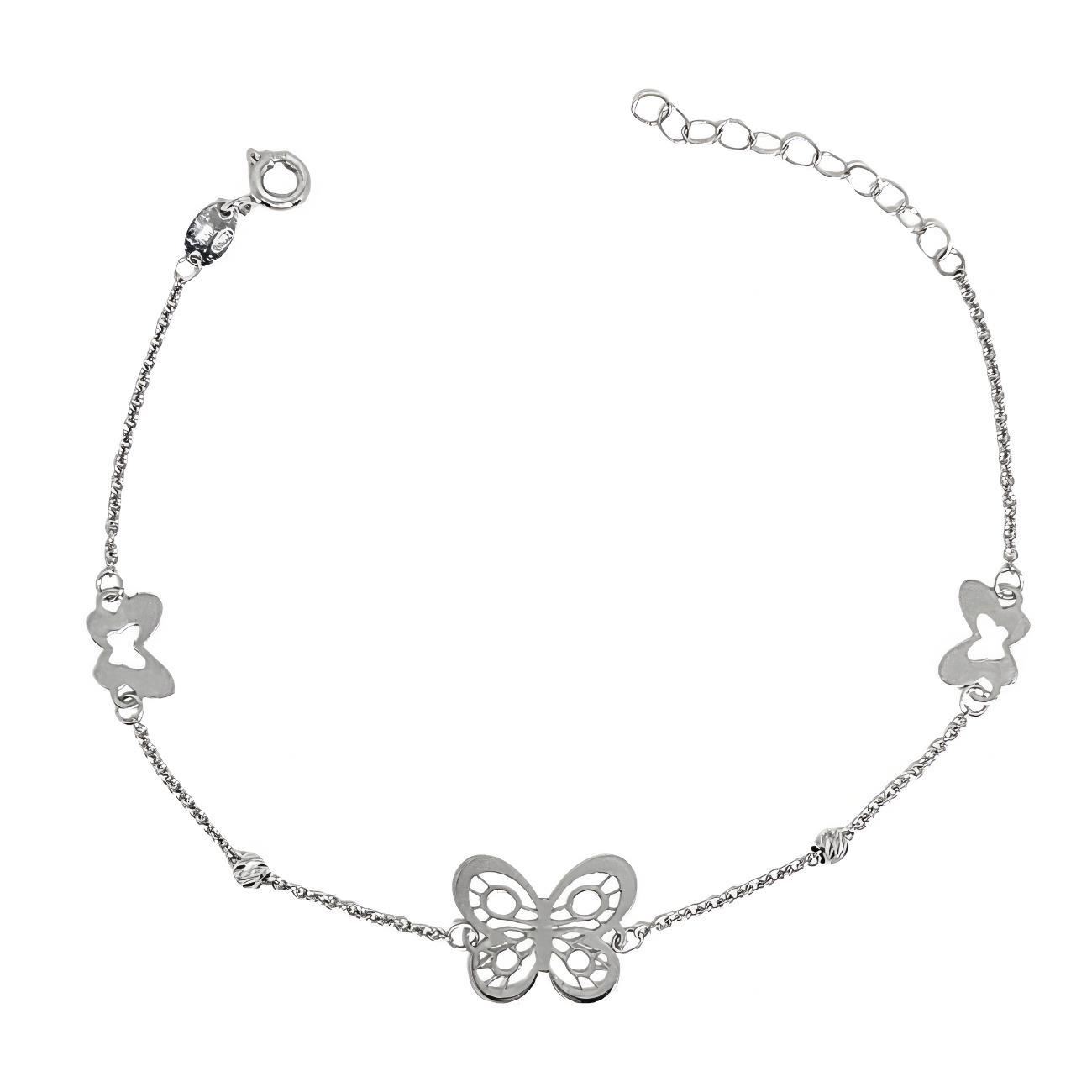 Pulsera Oro Blanco de 18 quilates con mariposas de 15mm y 9mm, largo de 18cm, con alargador de 3cm.