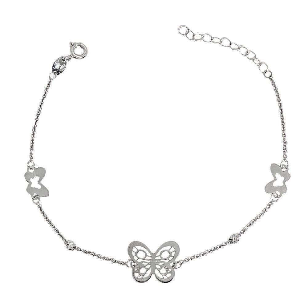 Pulsera Oro Blanco de 18 quilates con mariposas de 15mm y 9mm, largo de 18cm con alargador de 3cm.