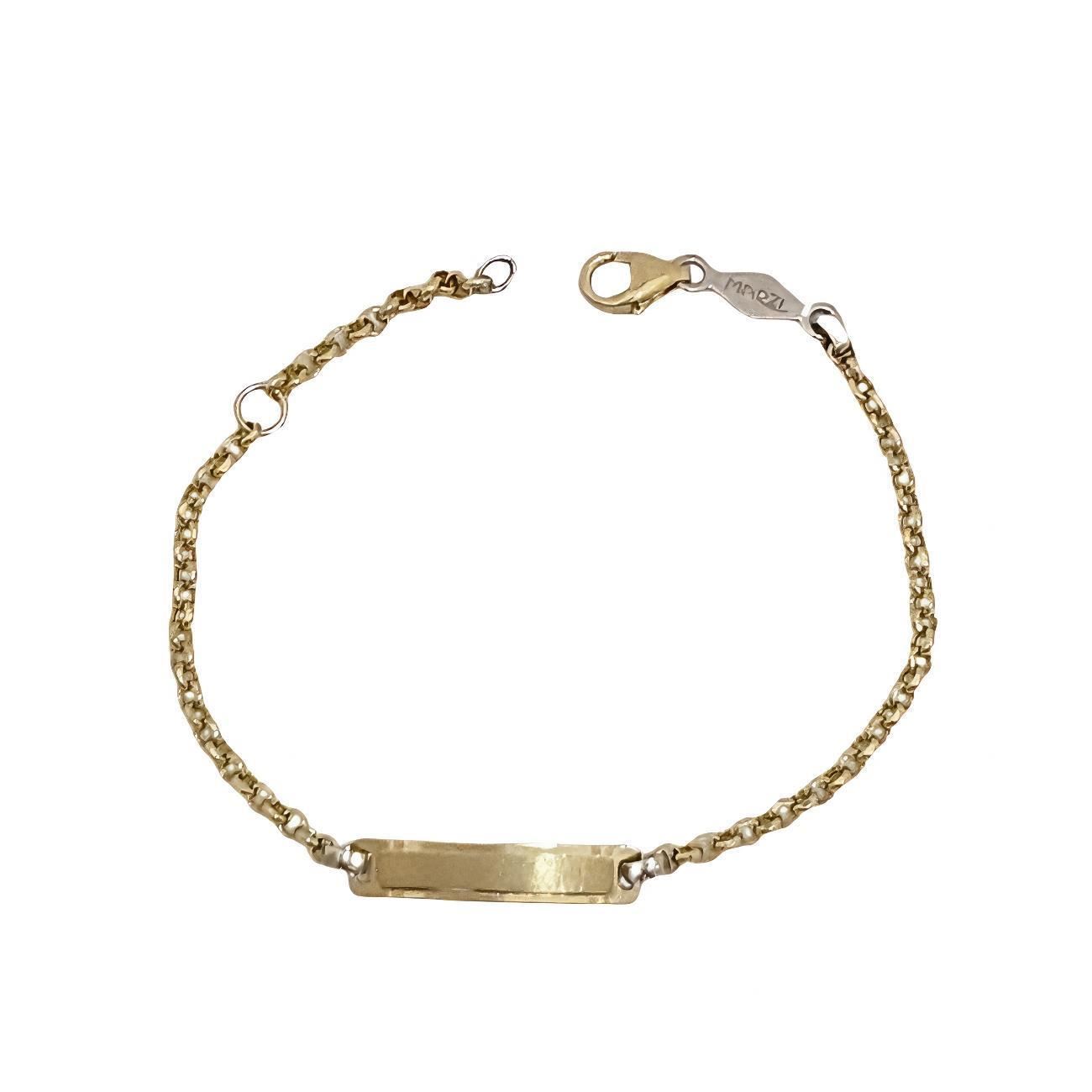 Pulsera bebé Oro Amarillo y Blanco de 18 quilates con placa de 3.7x18mm, largo de 14cm.