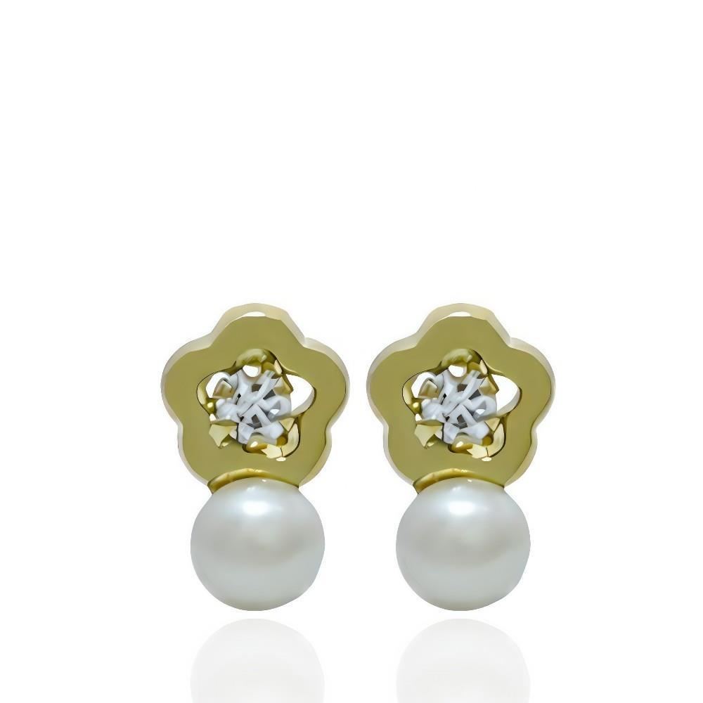 Pendientes Oro Amarillo de 18 quilates de flor con circonita y perla, 10mm y cierre catalán. Opción de sortija a juego.