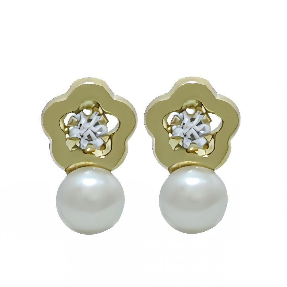 Pendientes Oro Amarillo de 18 quilates de flor con circonita y perla, 10mm y cierre catalán. Opción de sortija a juego.