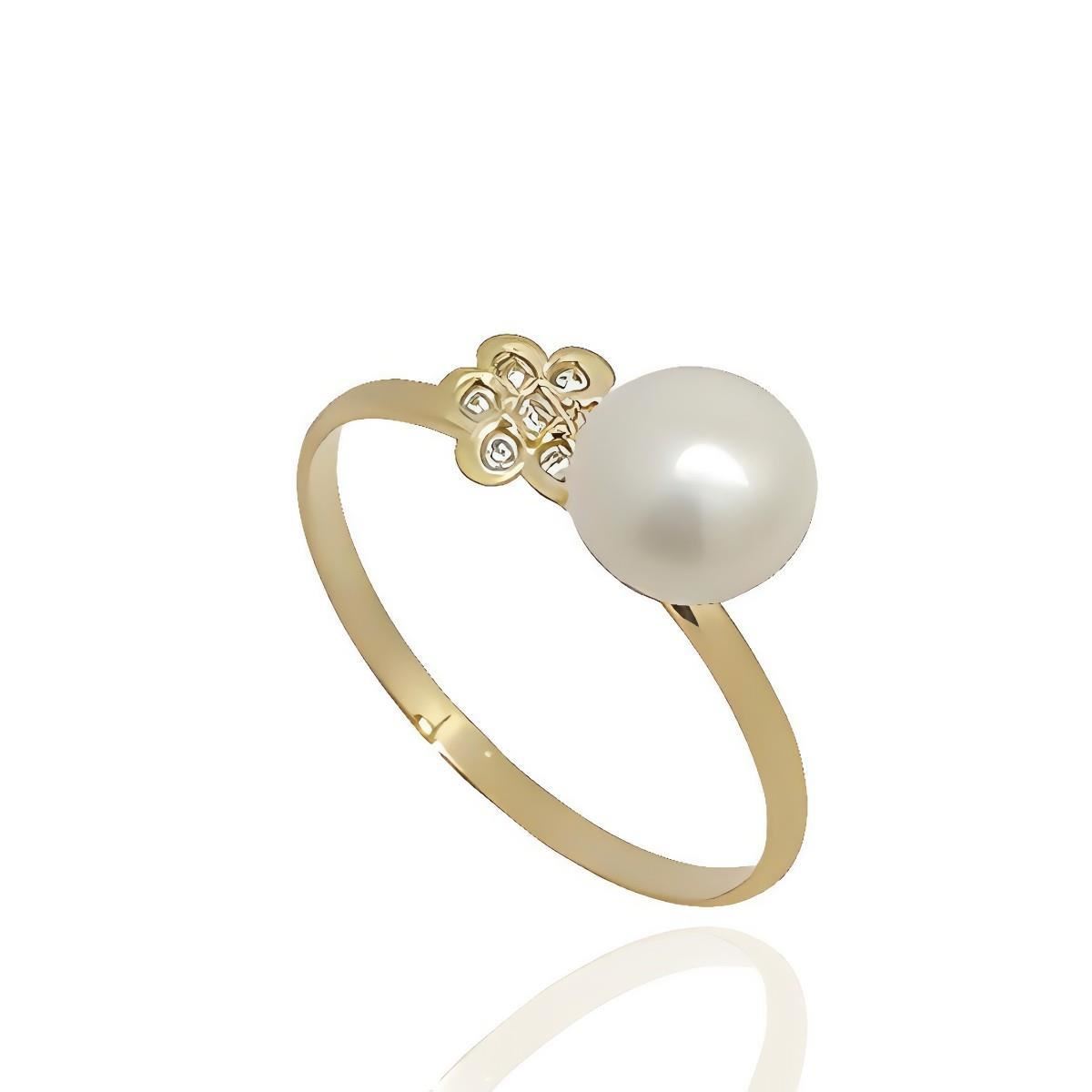 Sortija Oro Amarillo de 18 quilates de flor con circonitas y perla, 12mm y brazo liso.