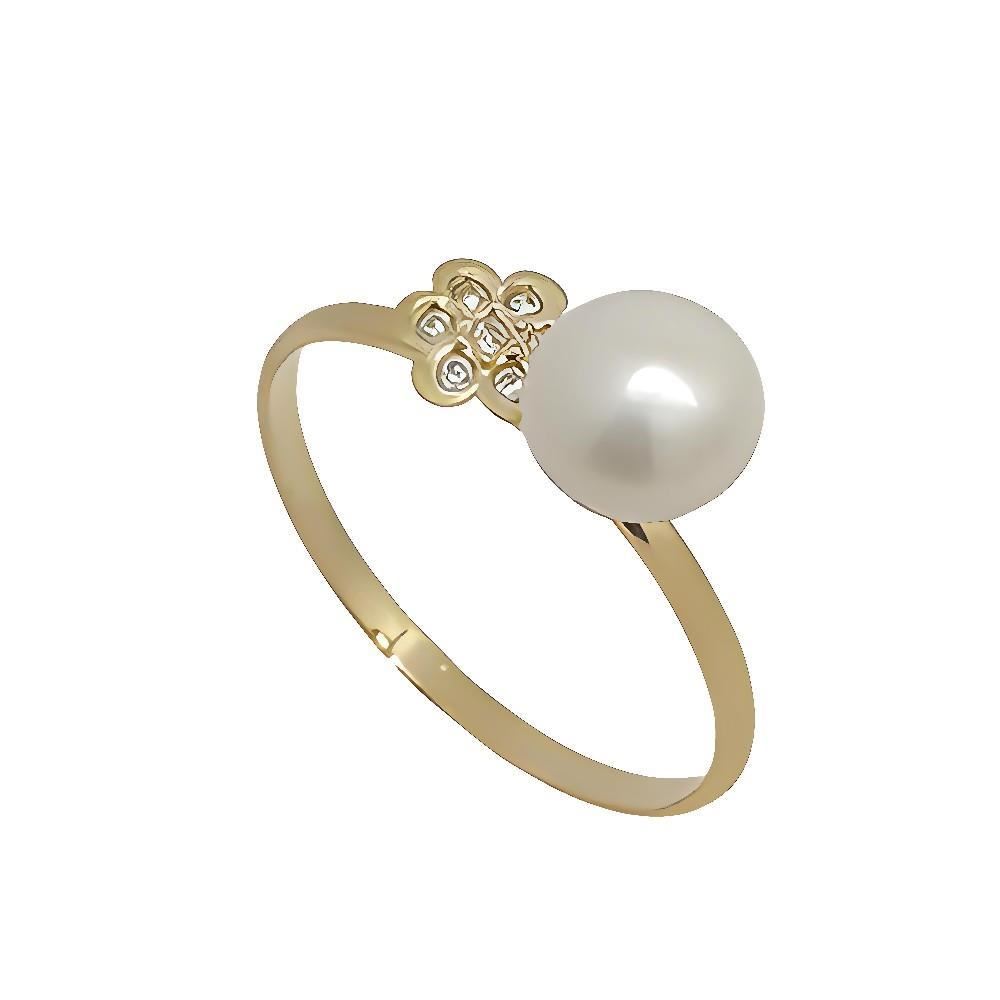 Sortija Oro Amarillo de 18 quilates de flor con circonitas y perla, 12mm y brazo liso.