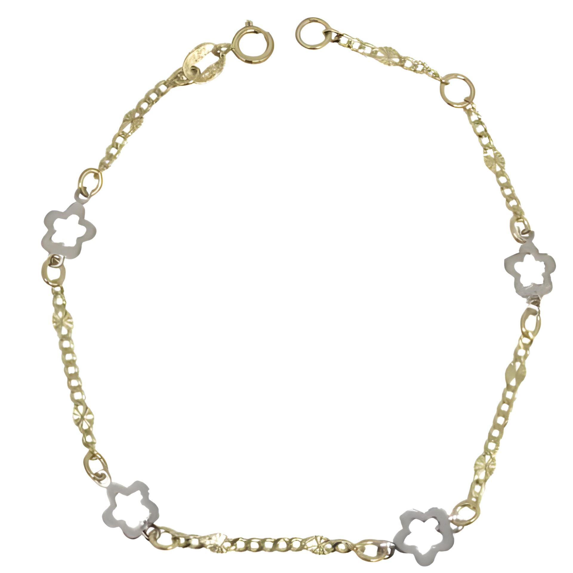 Pulsera Oro Amarillo y Blanco de 18 quilates con flores de 6.5mm, largo de 18cm con anilla a 2cm para poder ajustar.