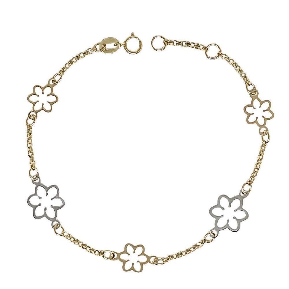 Pulsera Oro Amarillo y Blanco de 18 quilates con flores de 7 y 9mm, largo de 18.5cm con anilla para ajustar a la medida deseada.