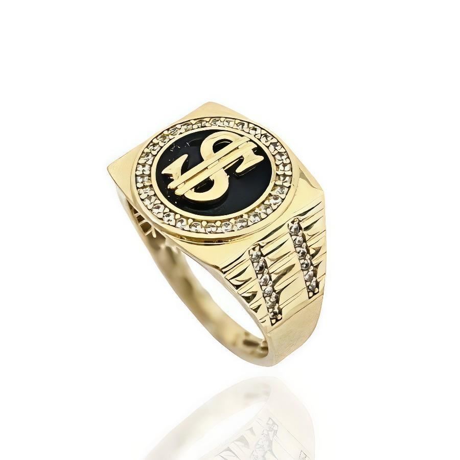 Sello Oro Amarillo de 18 quilates de dólar con ónix y circonitas, ancho de 14mm.