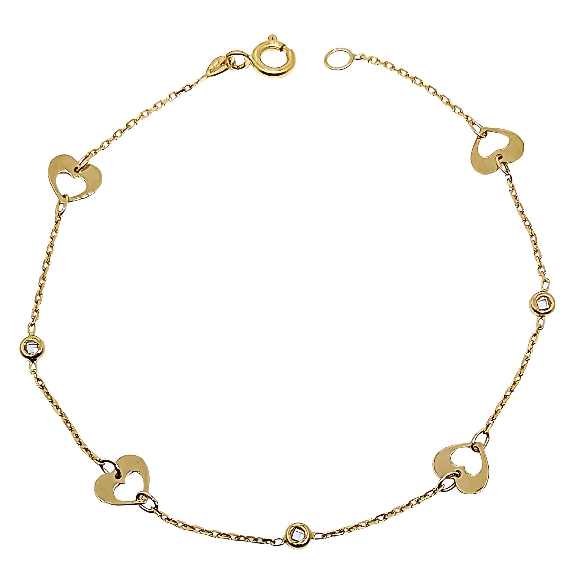 Pulsera Oro Amarillo de 18 quilates, motivo de corazones y circonitas, largo de 18,5cm.
