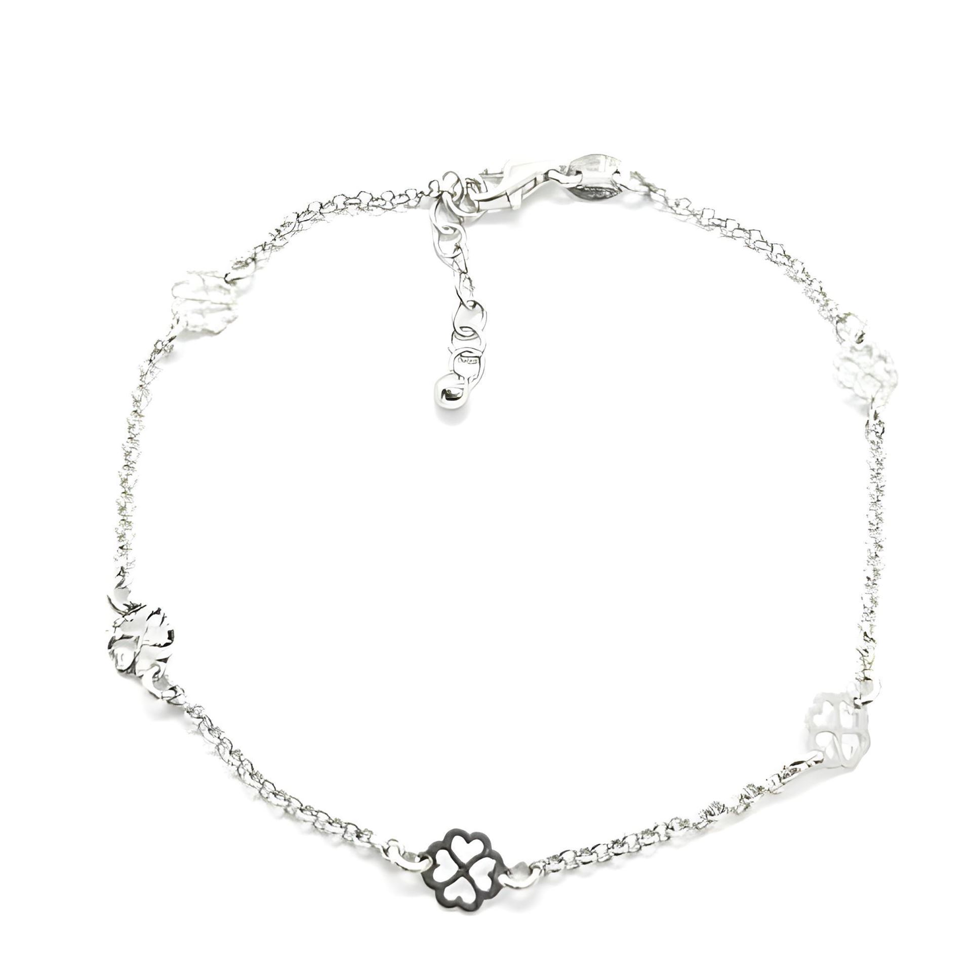 Pulsera Plata de Ley con tréboles de 5mm, largo de 19cm con alargador a 2cm para poder ajustar a la medida deseada.