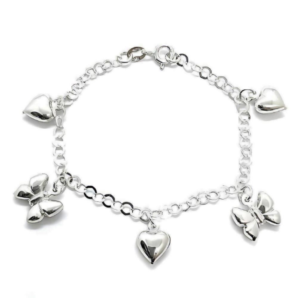 Pulsera Plata de Ley con mariposas y corazones de 11mm, largo de 17cm.