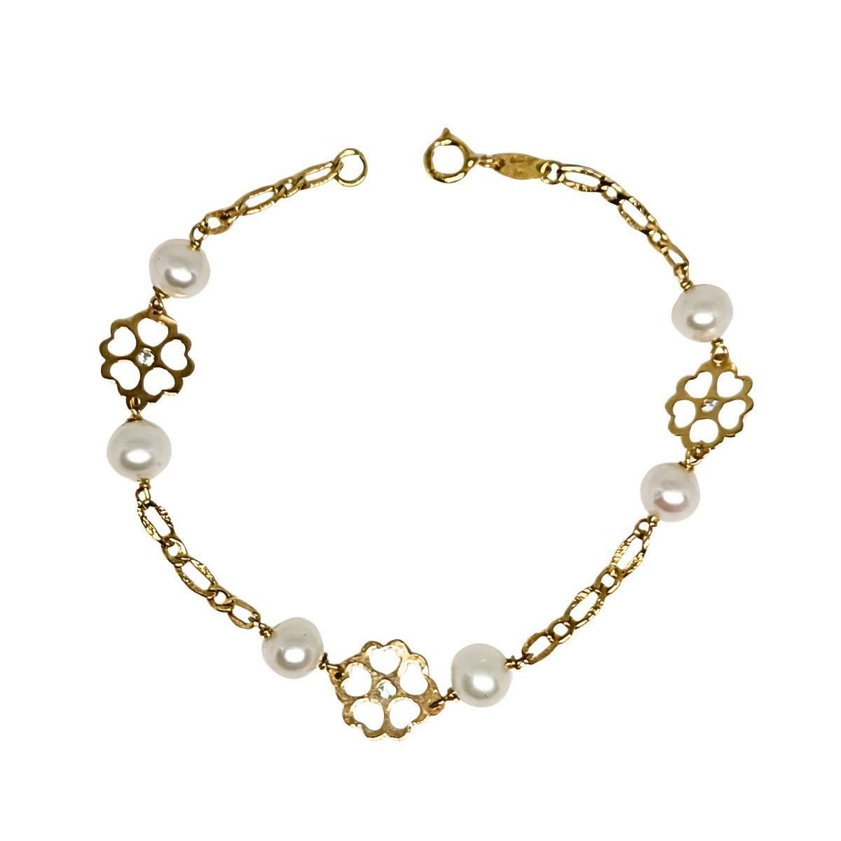 Pulsera Oro Amarillo de 18 quilates con flores de 9mm y perlas de 5mm, largo de 17cm.