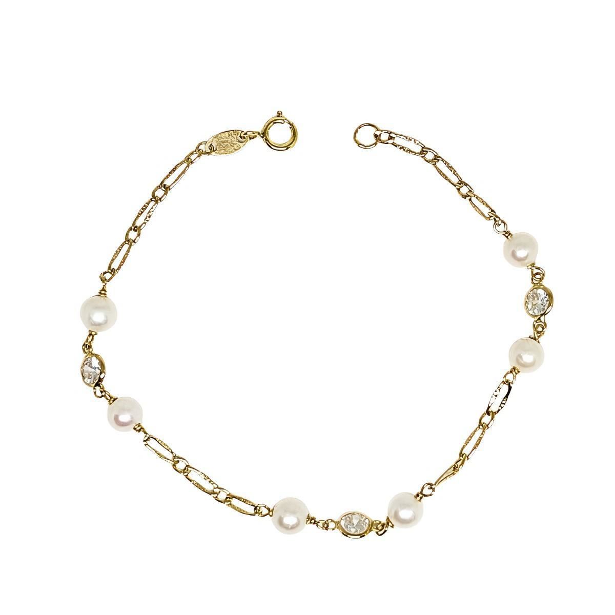 Pulsera Oro Amarillo de 18 quilates con circonitas y perlas de 5mm, largo de 17cm.