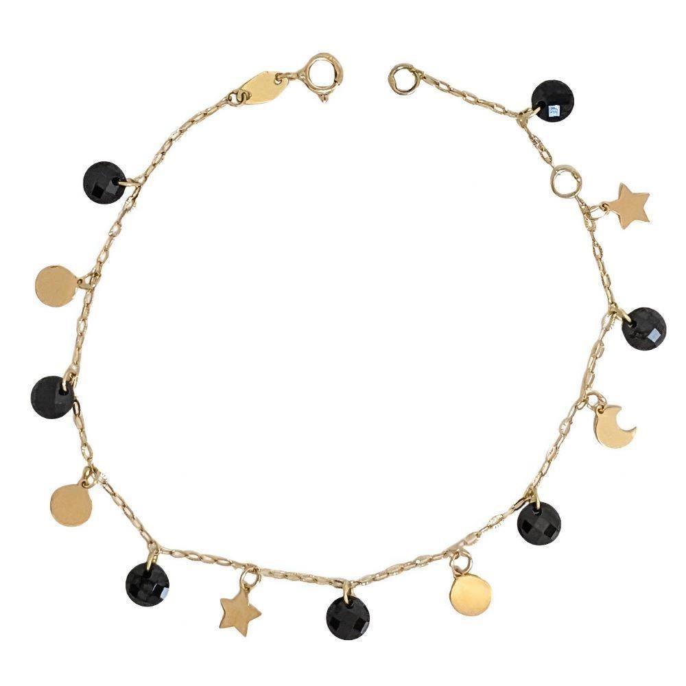 Pulsera Oro Amarillo de 18 quilates con piedras negras y motivos de 5mm, largo de 18.5cm con anilla a 2.5cm para ajustar a la medida deseada.
