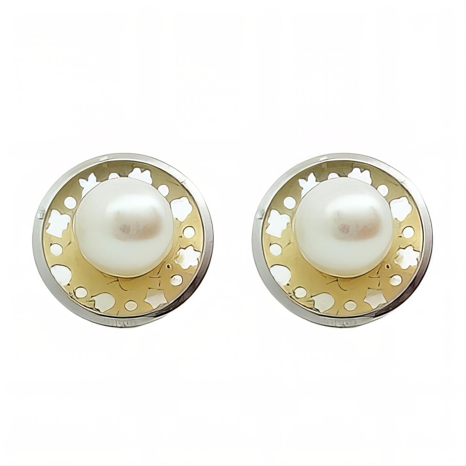 Pendientes Oro Amarillo y Blanco de 18 quilates redondos con perla, de 8mm y cierre de presión.