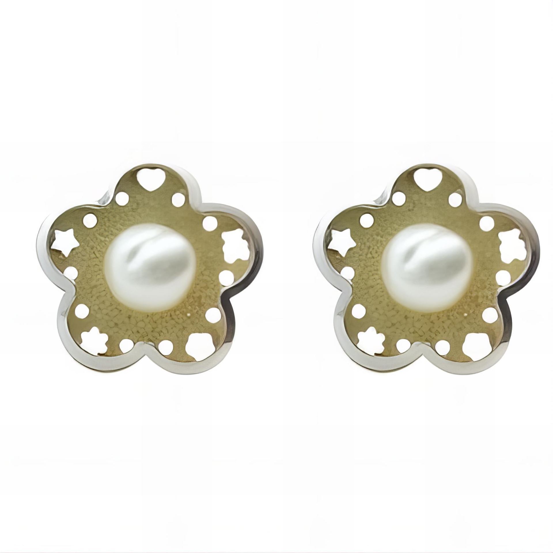 Pendientes Oro Amarillo y Blanco de flor con perla, de 8mm y cierre de rosca.