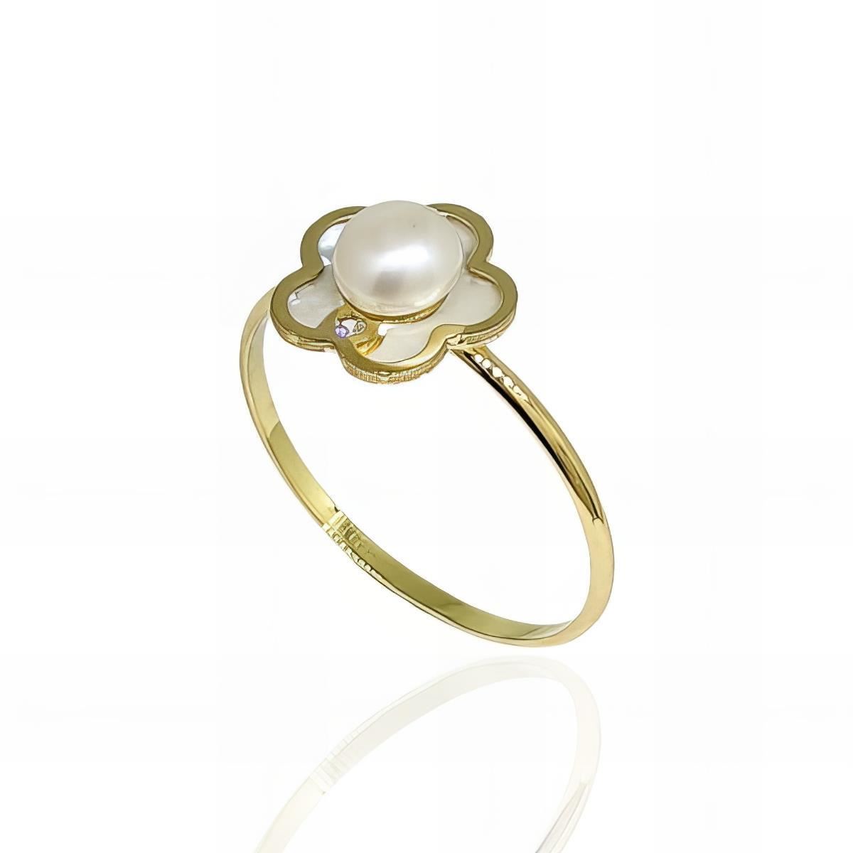 Sortija Oro Amarillo de 18 quilates de flor con perla, circonita y nácar, 8.5mm y brazo liso.