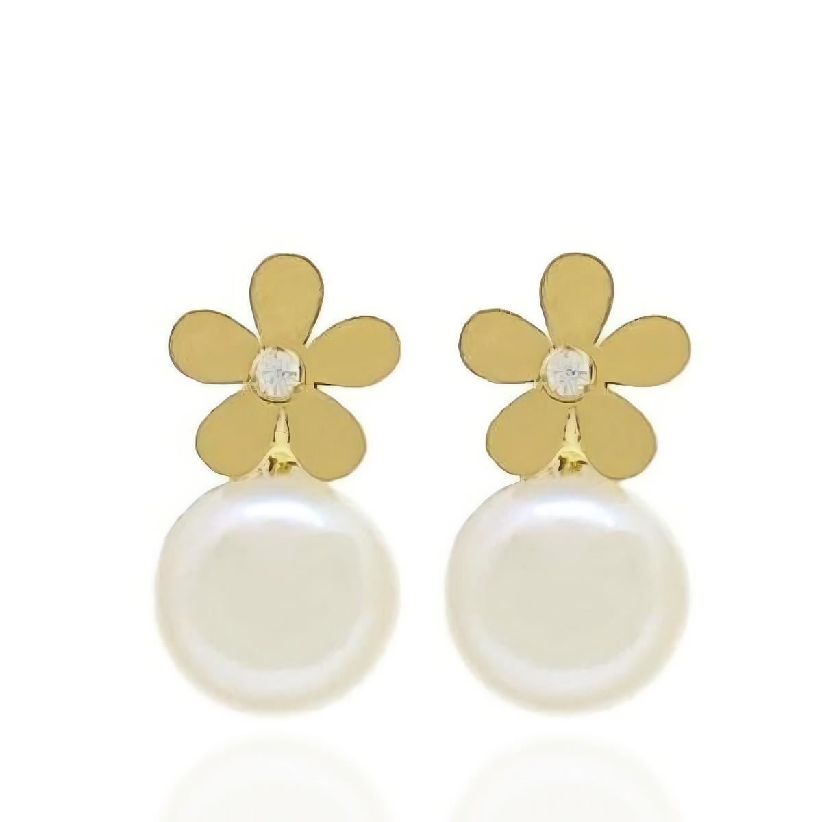 Pendientes Oro Amarillo de 18 quilates de flor con circonita y perla, 13mm y cierre de presión.