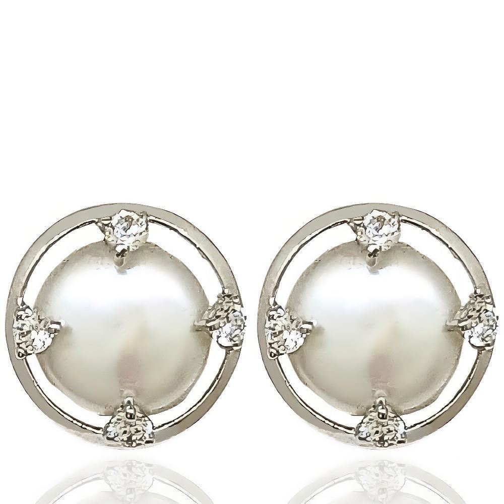 Pendientes Oro Blanco de 18 quilates de perla con circonitas, 13mm y cierre de presión.