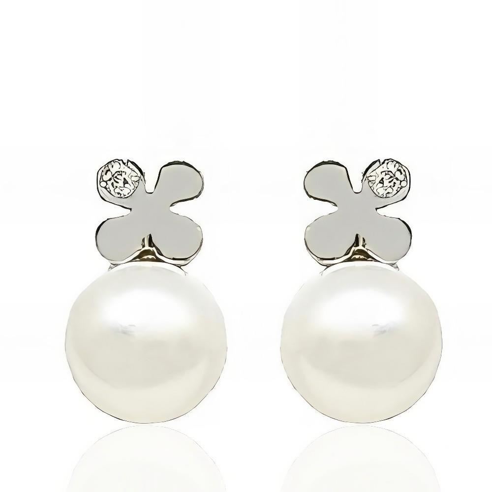 Pendientes Oro Blanco de 18 quilates de flor y perla, 11mm y cierre catalán.