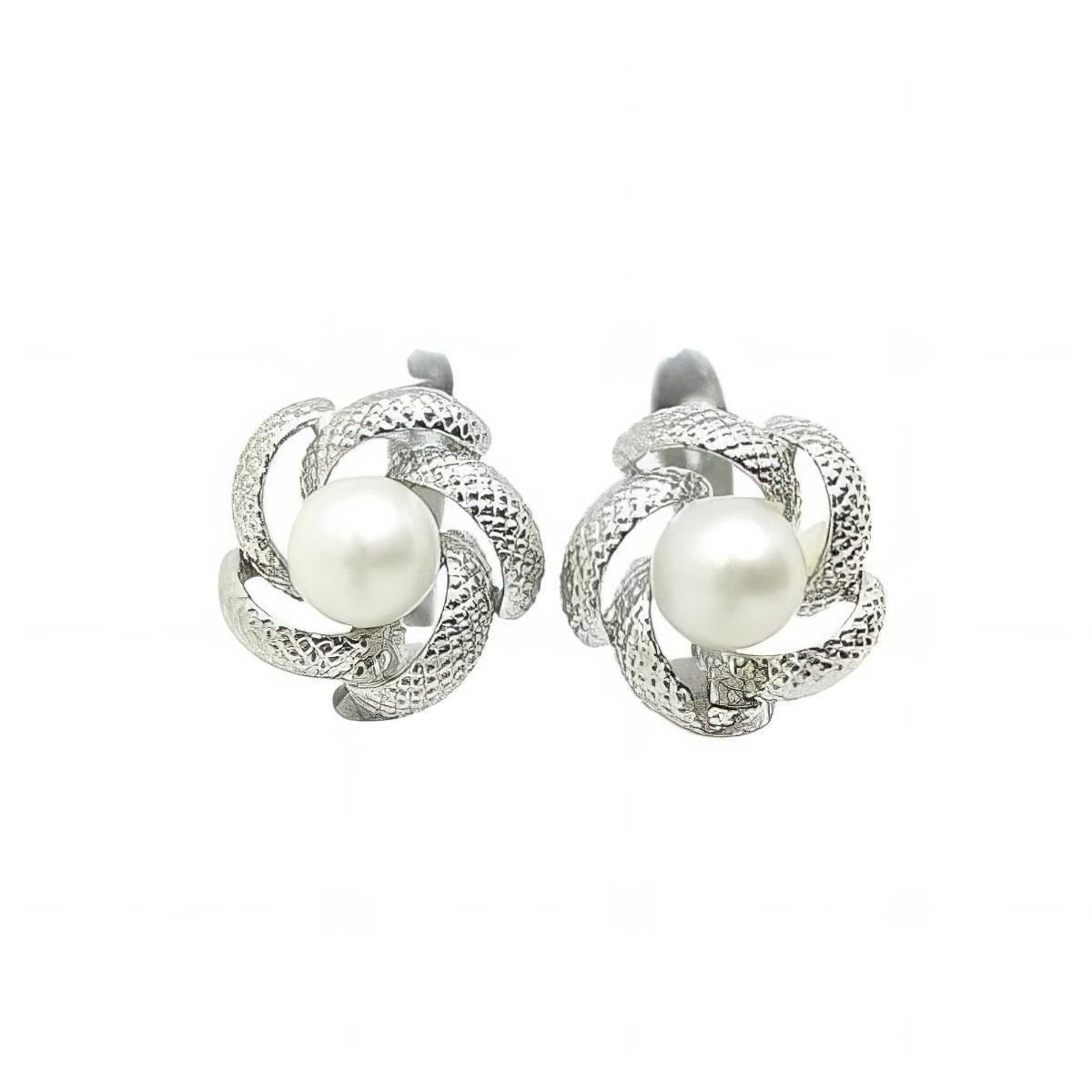Pendientes Plata de Ley de flor con perla y circonitas, 10mm y cierre catalán.