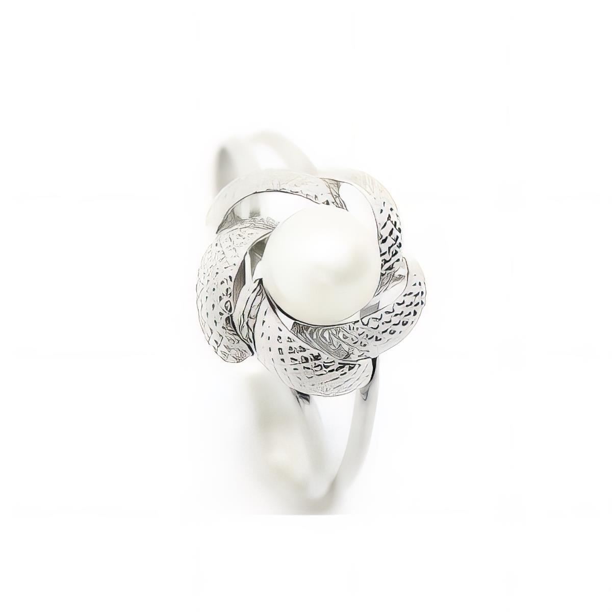 Sortija Plata de Ley con circonitas y perla, motivo flor 9mm de ancho y 9mm de alto, brazo en disminución.
