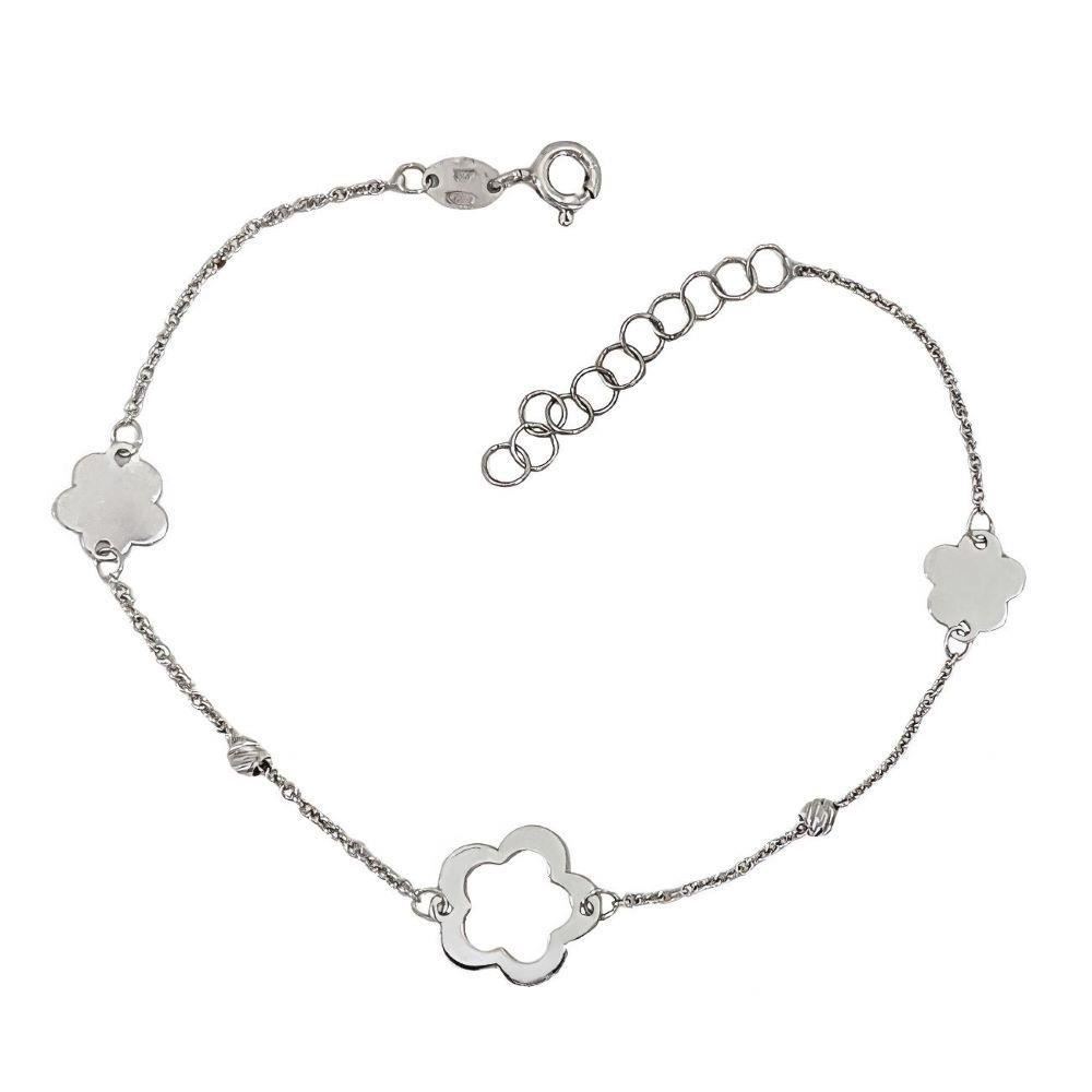 Pulsera Oro Blanco de 18 quilates con flores de 11 y 8mm, largo de 17cm con alargador de 2.5cm.