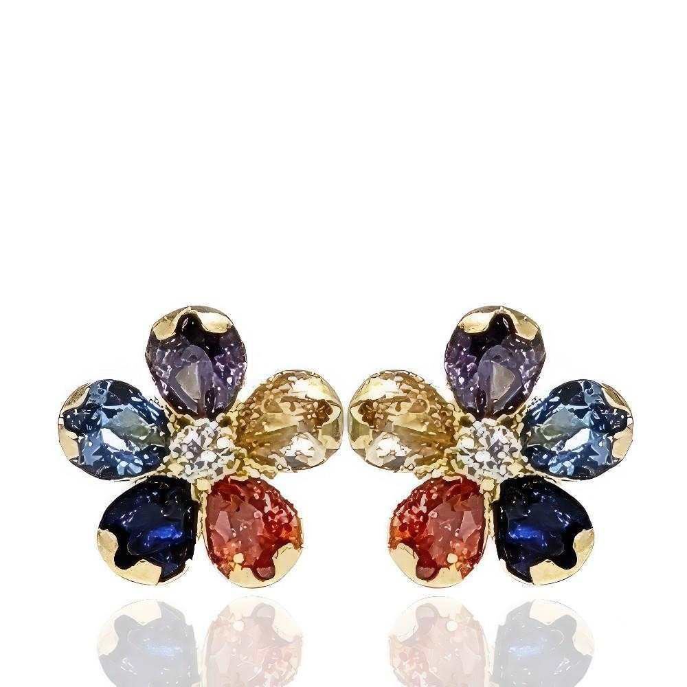 Pendientes Oro Amarillo de 18 quilates de flor con piedras de color, 9mm y cierre de presión.