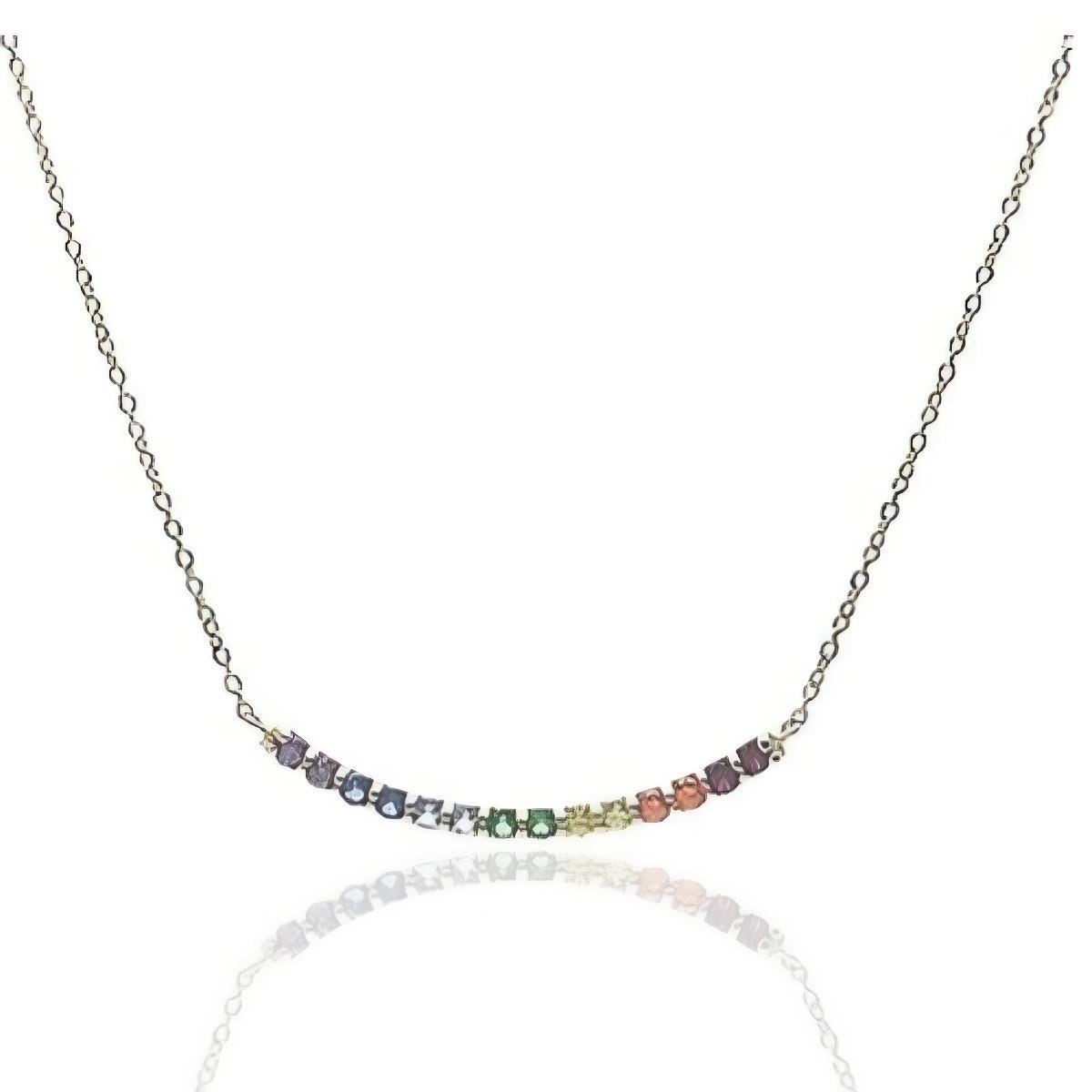 Gargantilla Oro Amarillo de 18 quilates con piedras de colores, motivo de 2mm de ancho y 25mm de largo, cadena de 45cm con anilla a 3cm para ajustar a la medida deseada.