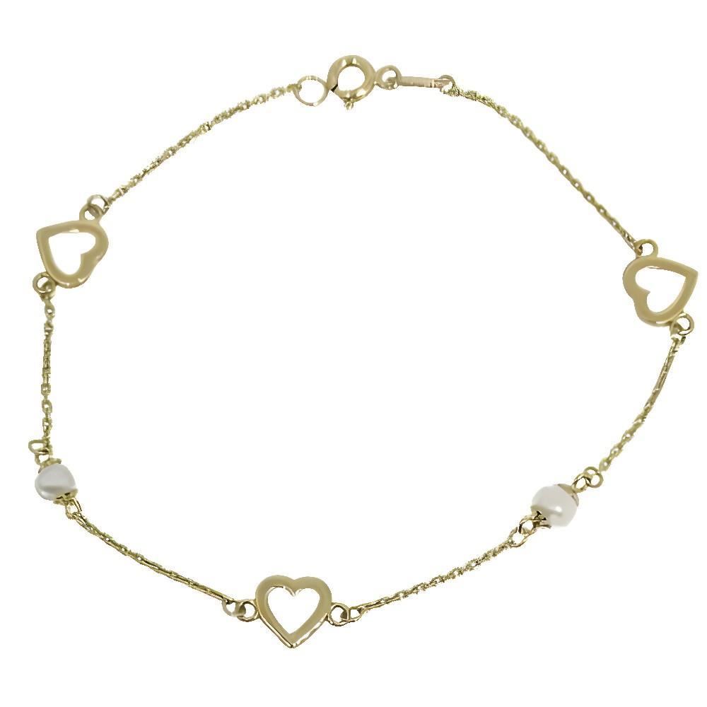 Pulsera Oro Amarillo de 18 quilates con corazones de 7mm y perlas de 3mm, largo de 19cm.
