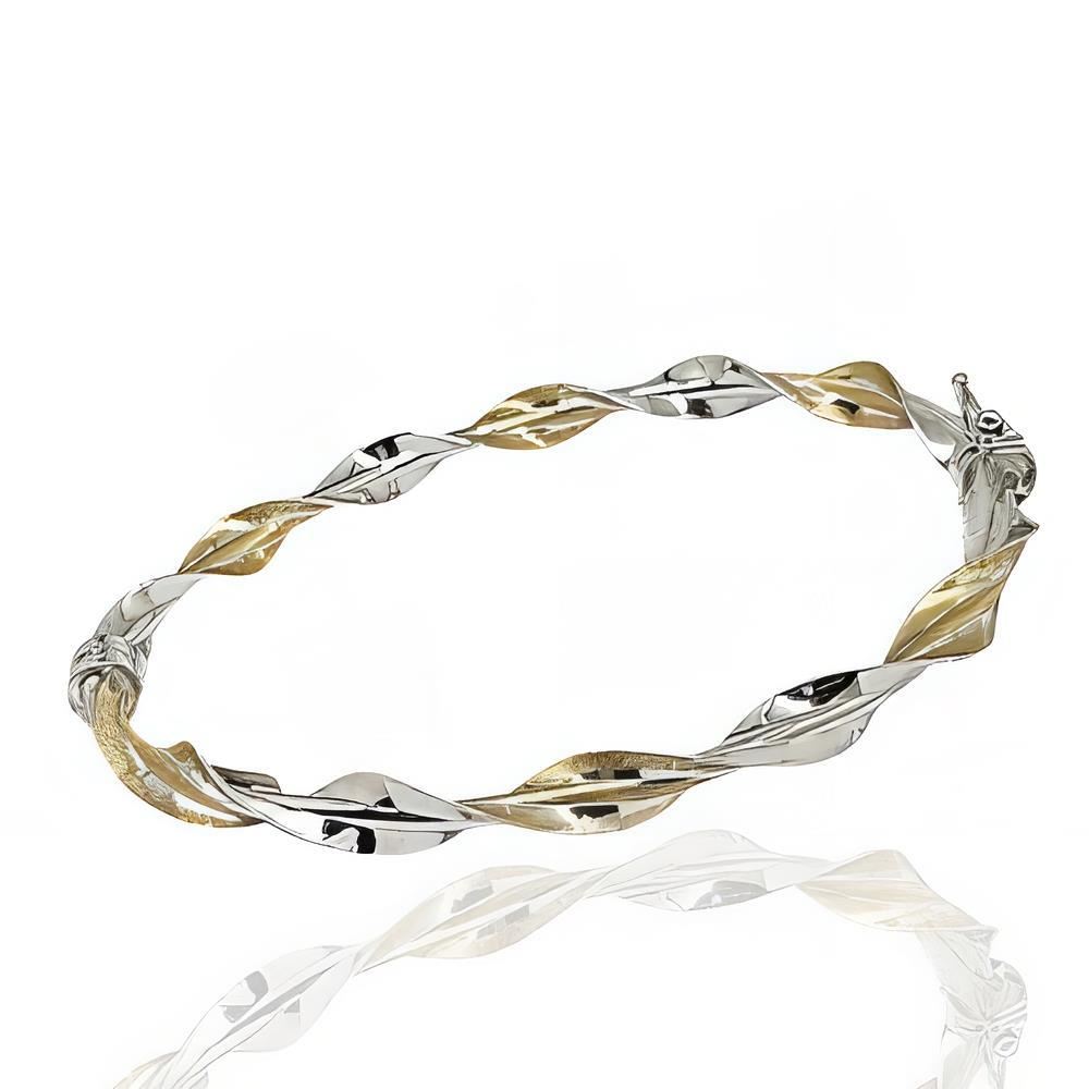 Caña Oro Amarillo y Blanco de 18 quilates retorcida, 5mm de ancho y 65mm de diámetro, cierre de lengüeta y de ocho.