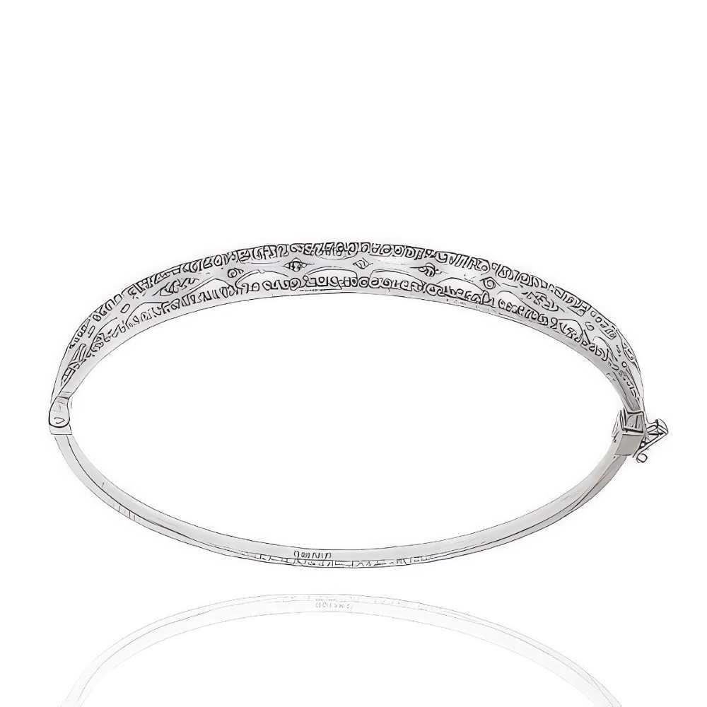 Caña Oro Blanco de 18 quilates con circonitas, 5mm de ancho y 57mm de diámetro, con cierre de lengüeta y de ocho.