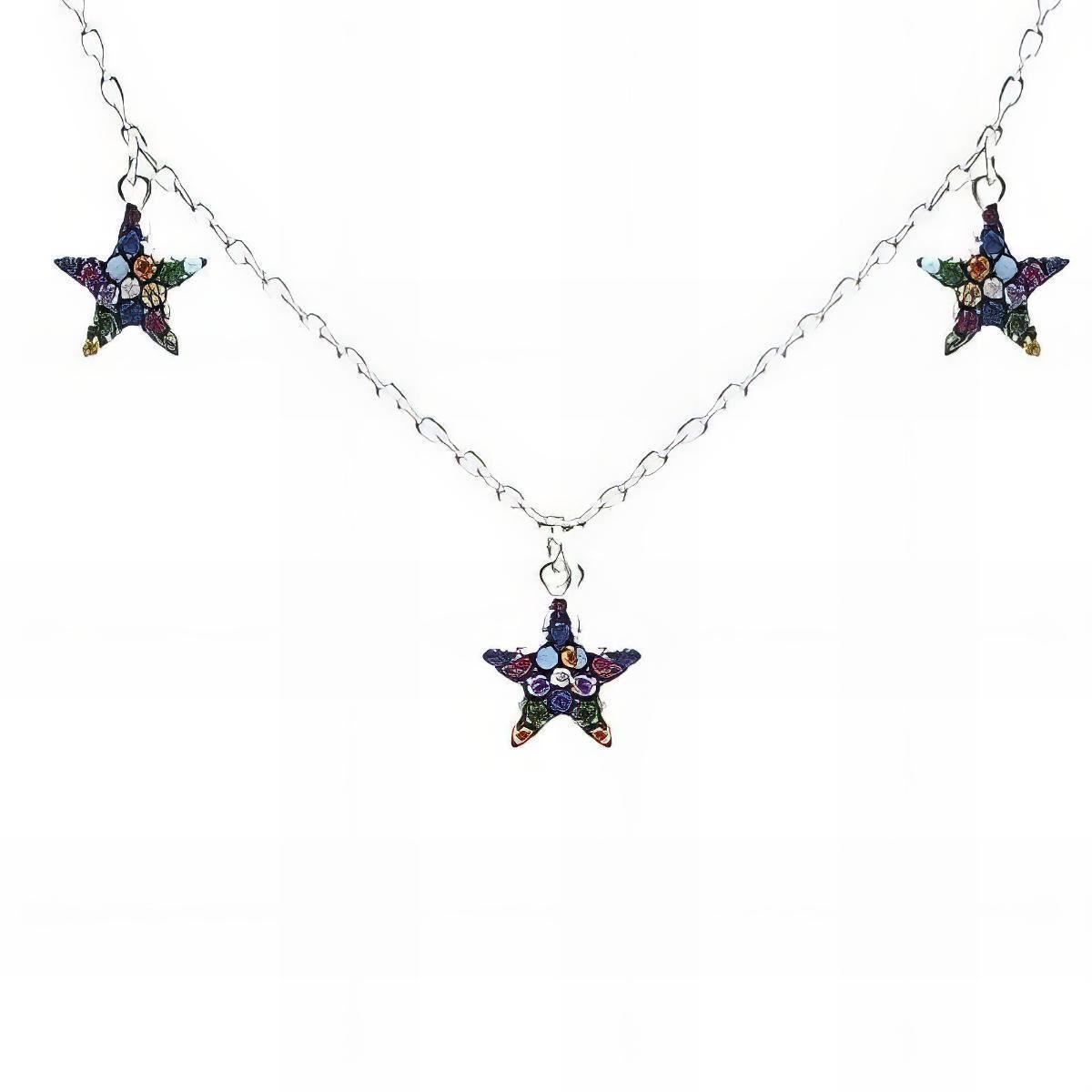 Gargantilla Plata de Ley rodiada con estrellas en piedras de colores de 9mm, largo de 42cm con alargador de 5cm para ajustar a la medida deseada.