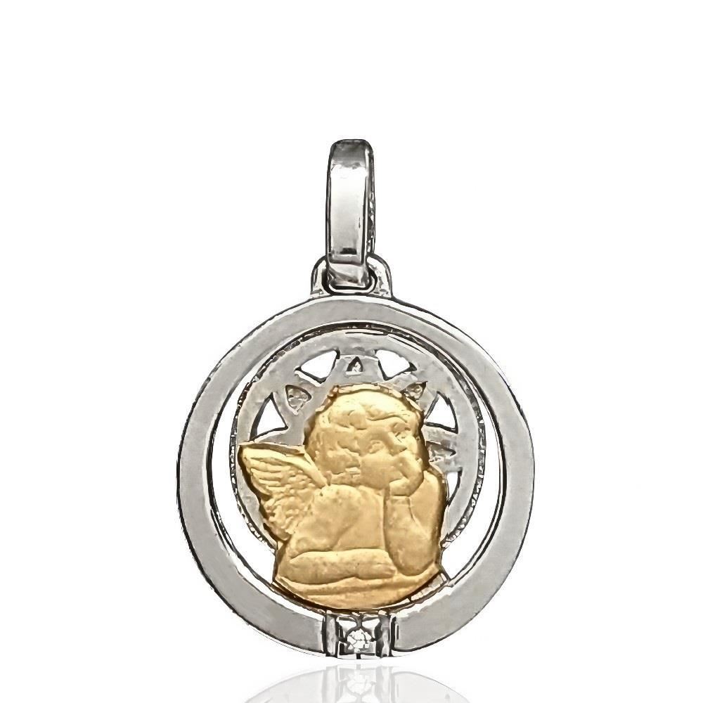 Medalla Oro Amarillo de 18 quilates y Plata de Ley de Ángel con brillante, 16mm sin contar asa. Firma Finor.