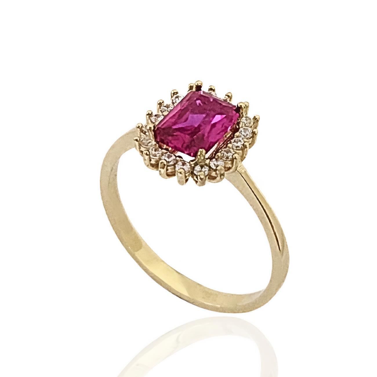Sortija Oro Amarillo de 18 quilates con piedra Rubí y circonitas, medida de 11mm.
