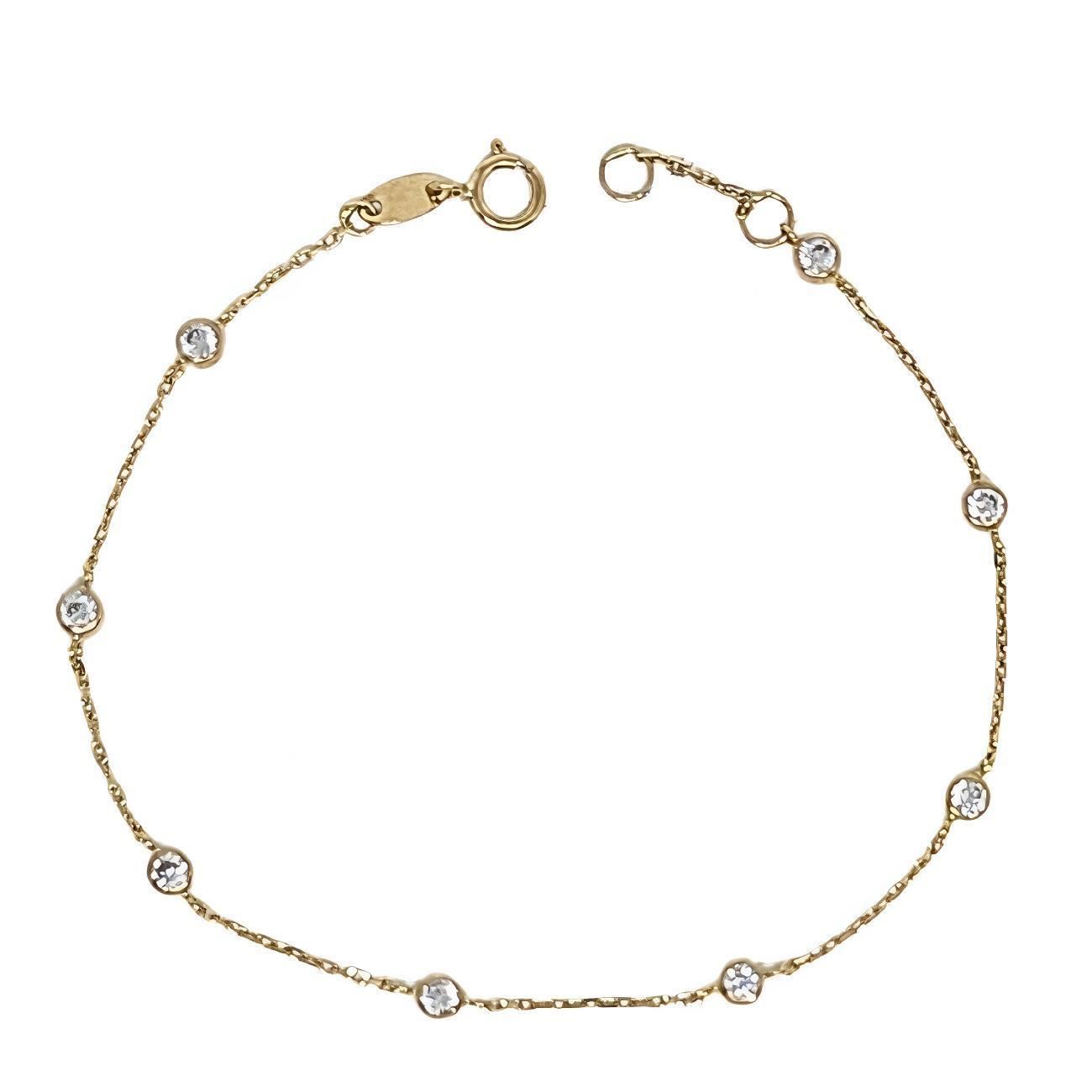 Pulsera Oro Amarillo de 18 quilates con circonitas en chatón de 3mm, largo de 18cm con anilla a 1.5cm para ajustar a la media deseada.
