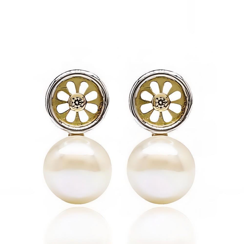 Pendientes Oro Amarillo y Blanco de 18 quilates con perla y circonita, 14mm y cierre catalán.
