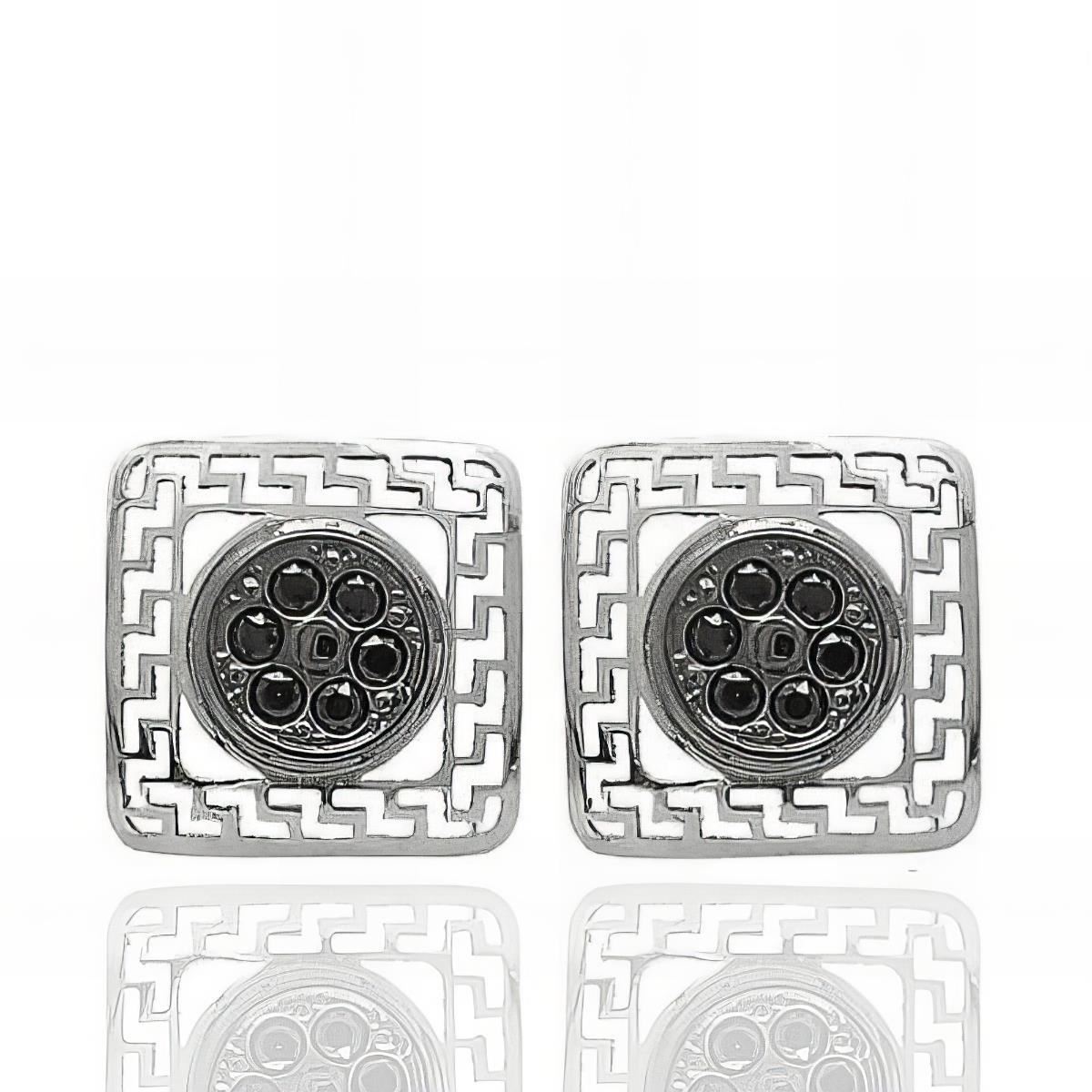 Pendientes Oro Blanco de 18 quilates cuadrados con circonitas negras, con greca calada de 8mm y cierre de presión.