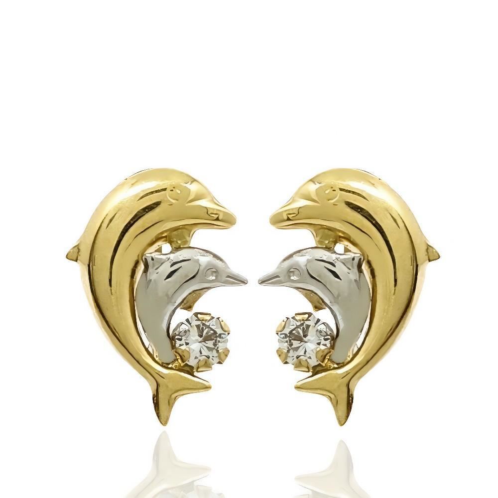 Pendientes Oro Amarillo y Blanco de 18 quilates de delfines con circonitas, 14mm y cierre catalán.
