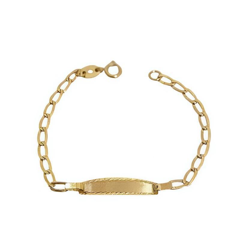 Pulsera bebé Oro Amarillo de 9 quilates con cadena bilbao y placa de 4x20mm, largo de 12.5cm.